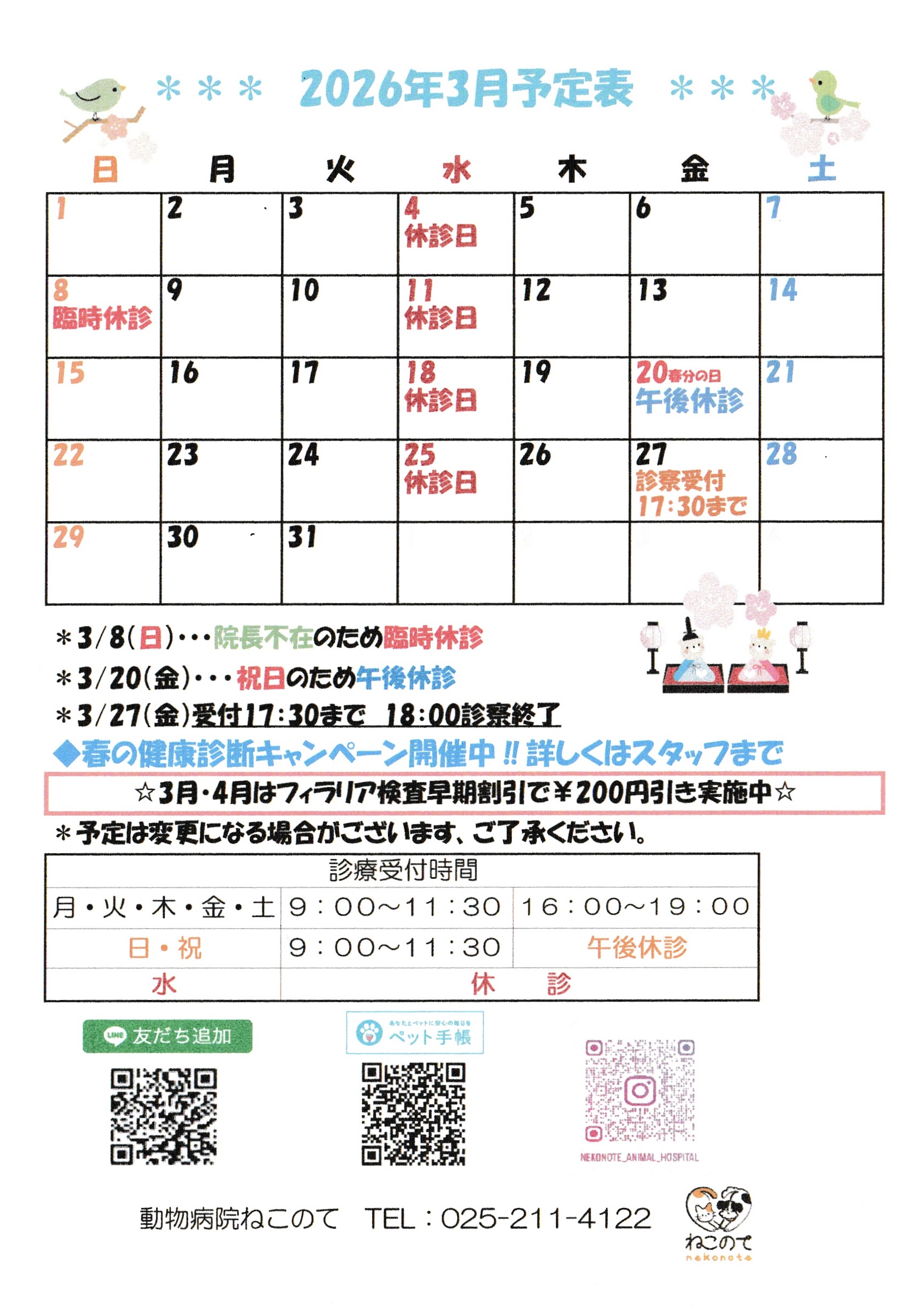 3月27日金曜日 新潟市獣医師会総会のため 午後診察17:30まで